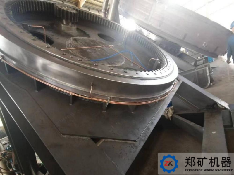 我司簽訂的湖北客戶120萬(wàn)噸/年半水磷石膏綜合利用項(xiàng)目中圓盤造球機(jī)設(shè)備,其傳動(dòng)部分不同于同系列一般造球機(jī)設(shè)備,利用回轉(zhuǎn)支撐裝置代替常規(guī)的齒輪組嚙合傳動(dòng),其安裝更簡(jiǎn)單方便、易于操作封閉式的殼體,更容易維修,安全性、可靠性較高結(jié)構(gòu)更加緊湊,更耐用,動(dòng)力源可選。回轉(zhuǎn)支承是介于機(jī)架與上部回轉(zhuǎn)盤體間作相對(duì)回轉(zhuǎn)運(yùn)動(dòng)的傳力原件,用于支承上車體質(zhì)量和承受工作載荷,共內(nèi)座圈鏈接下機(jī)體,外座圈鏈接上盤體,內(nèi)座圈上的內(nèi)齒圈與回轉(zhuǎn)小齒輪嚙合。當(dāng)回轉(zhuǎn)齒輪轉(zhuǎn)動(dòng)時(shí),通過(guò)小齒輪帶動(dòng)上盤體回轉(zhuǎn)。
