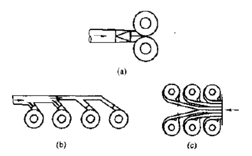 圖(a)是最簡(jiǎn)單的入口并聯(lián)方式,在進(jìn)氣管中氣體和灰塵的流動(dòng)是對(duì)稱的,兩個(gè)除塵器中的工作情況相同,效率和阻力相同;圖(b)所示連接,難以保證所有支管入口壓力相同,但安裝比較方便;圖(c)每經(jīng)過(guò)一個(gè)除塵器的入口之后,主管道就會(huì)縮小一些,進(jìn)入并聯(lián)的除塵器氣流可以自我補(bǔ)償,達(dá)到氣流基本平衡;