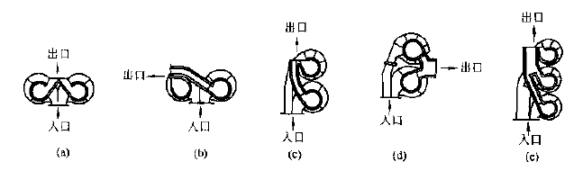 2.2排氣管并聯(lián)方式,并聯(lián)除塵器與排氣干管連接時(shí),往往為了回收壓力而采用蝸卷式出口。因?yàn)檫@種出口的方向可以隨意安排,故可根據(jù)具體情況采用不同的連接方式,見(jiàn)圖二。