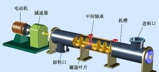 螺旋輸送機(jī)由聯(lián)軸器、進(jìn)、出料口、主軸裝置、軸承座裝配、中間軸承、底架裝配、支腿及驅(qū)動(dòng)等組成。螺旋輸送機(jī)本體由螺旋葉片、槽體、主軸裝置裝配而成。驅(qū)動(dòng)裝置為電機(jī)、減速機(jī)。